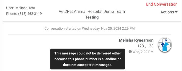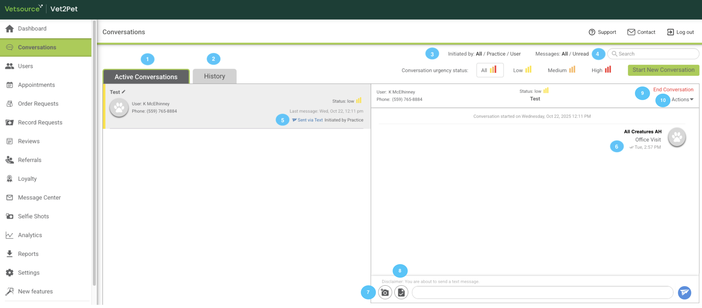 Delivery Method — Conversations can be initiated via 2-way texting by the user or the practice. The method will be displayed here.