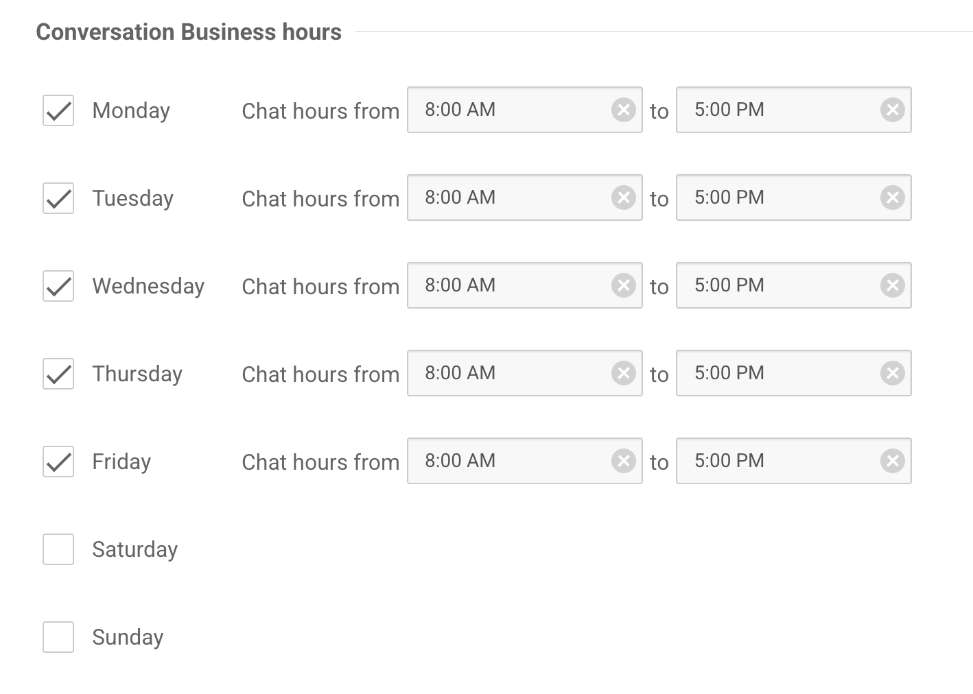 Decide what days of the week to accept incoming conversations and set conversation working hours for each day.Your Conversation Business Hours will initially be pre-set 8am-5pm Mon. - Fri.