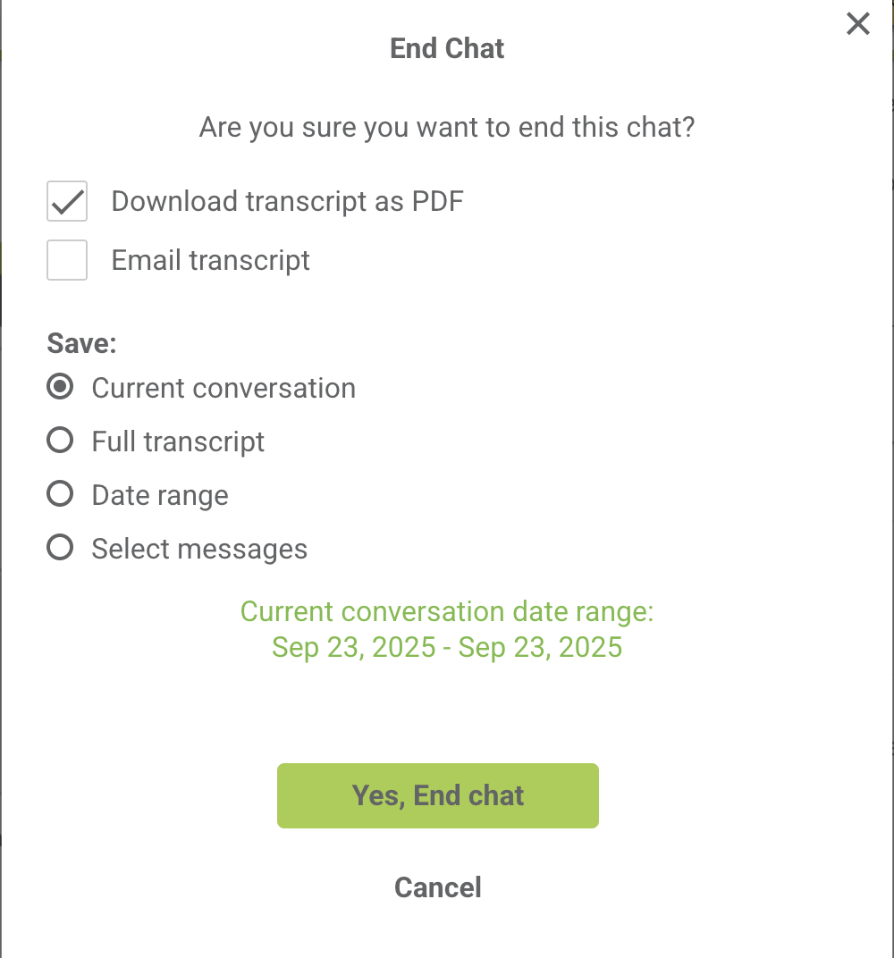 - Choose to enable the Message Selector if you would like to have options when creating a transcript for your medical record. You can elect to save the current conversation, full transcript, a date range, or even specific messages.
