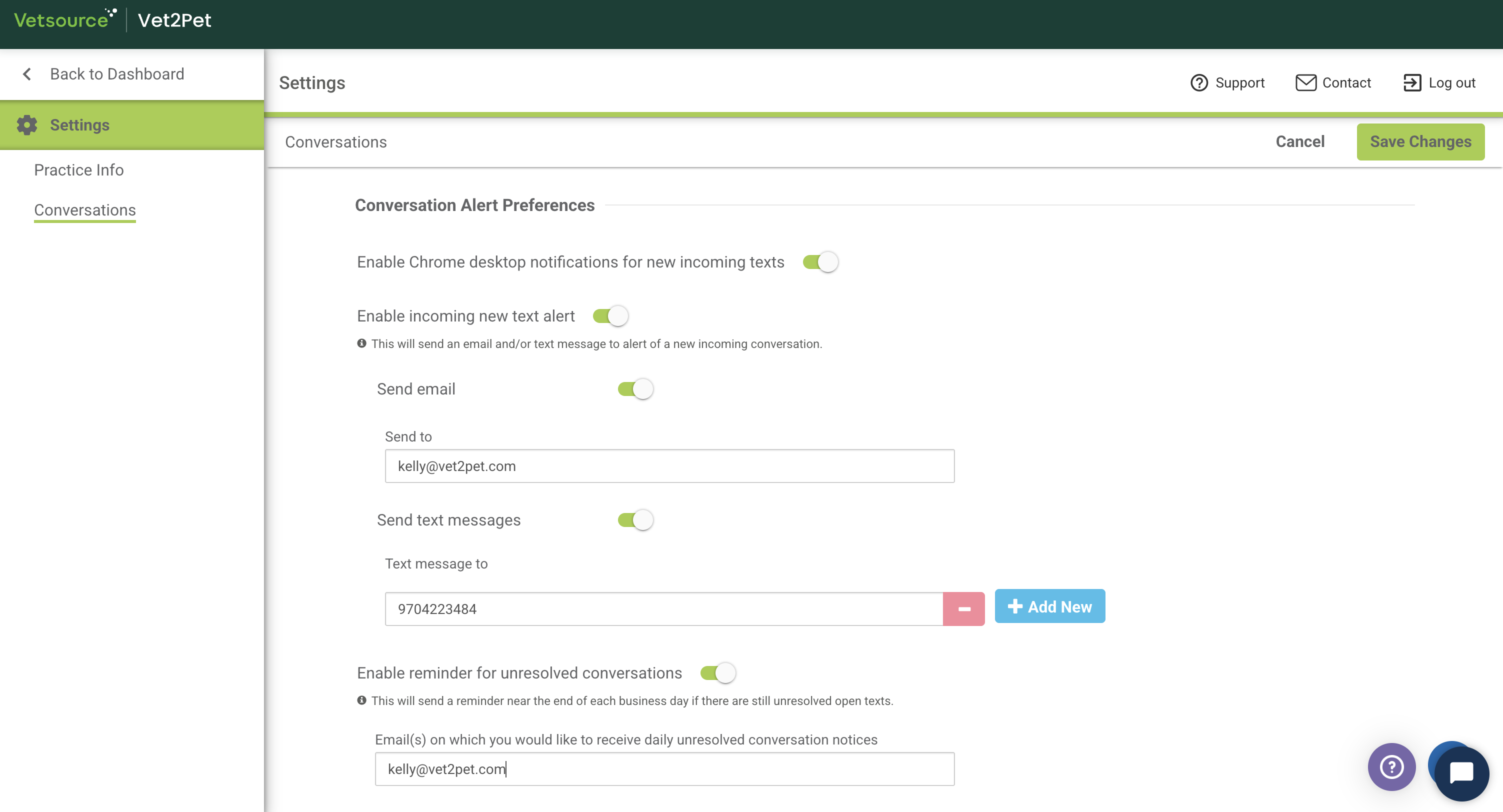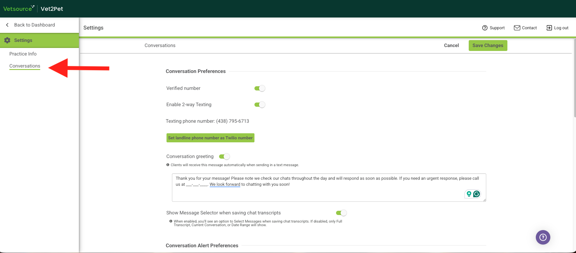 - From your Vet2Pet practice dashboard, customize your Conversation Preferences settings further: