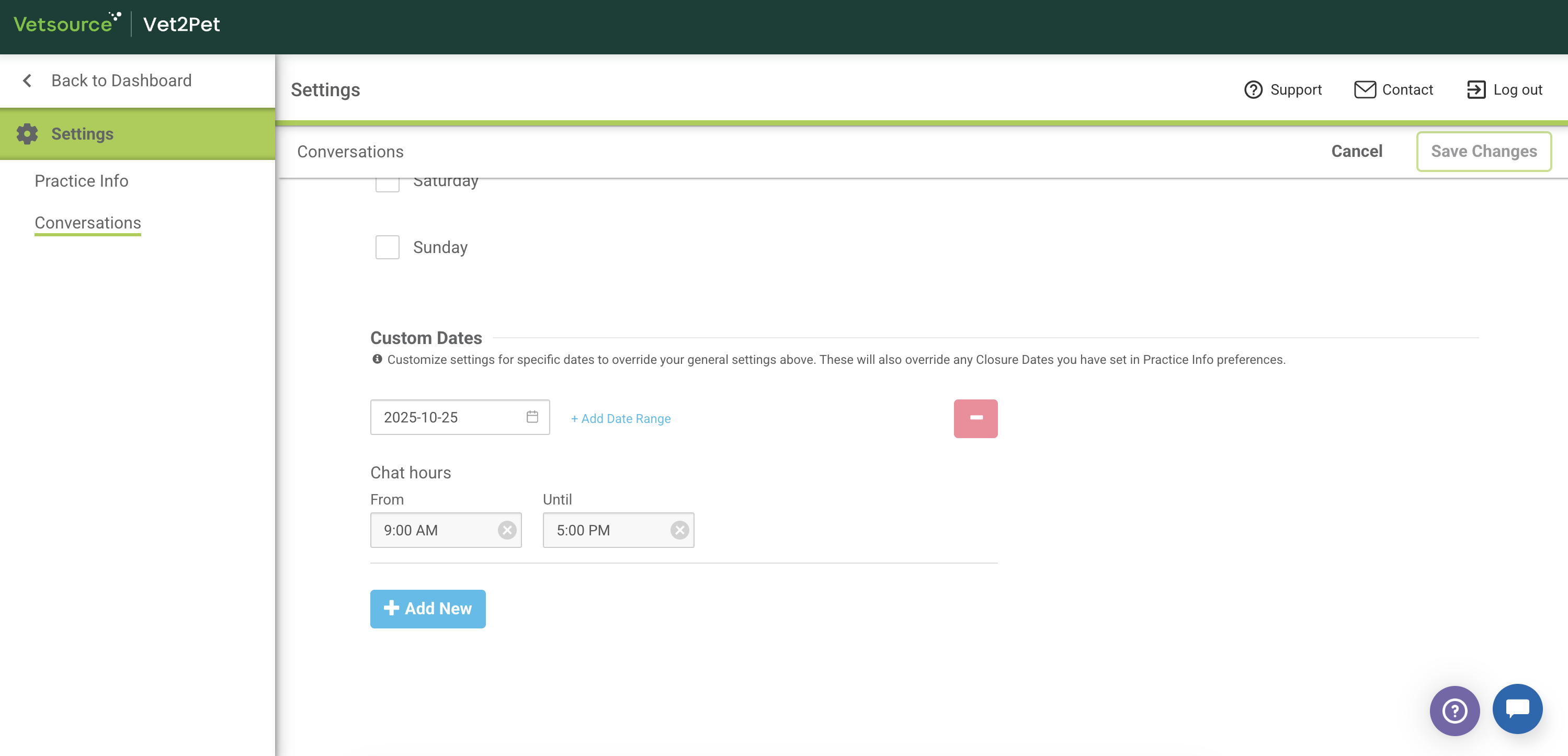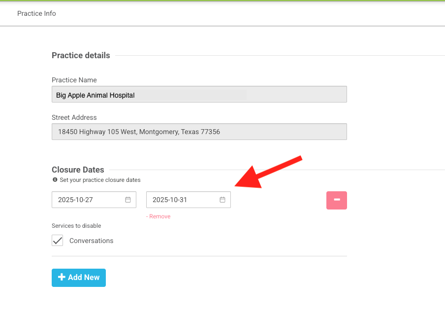- From your Vet2Pet practice dashboard, start by setting your practice Closure Dates to customize conversation availability. Use Closure Dates if your practice will be closed on a specific date or date range (holidays) outside of your normal schedule. Closure Dates should be used to reflect any days that are different from the general availability you will set up in the conversations settings.