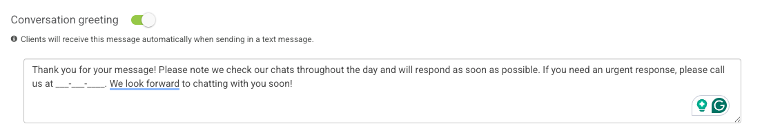 - If desired, set a Conversation Greeting, which will send automatically to the user as soon as a text message is received within conversation hours.